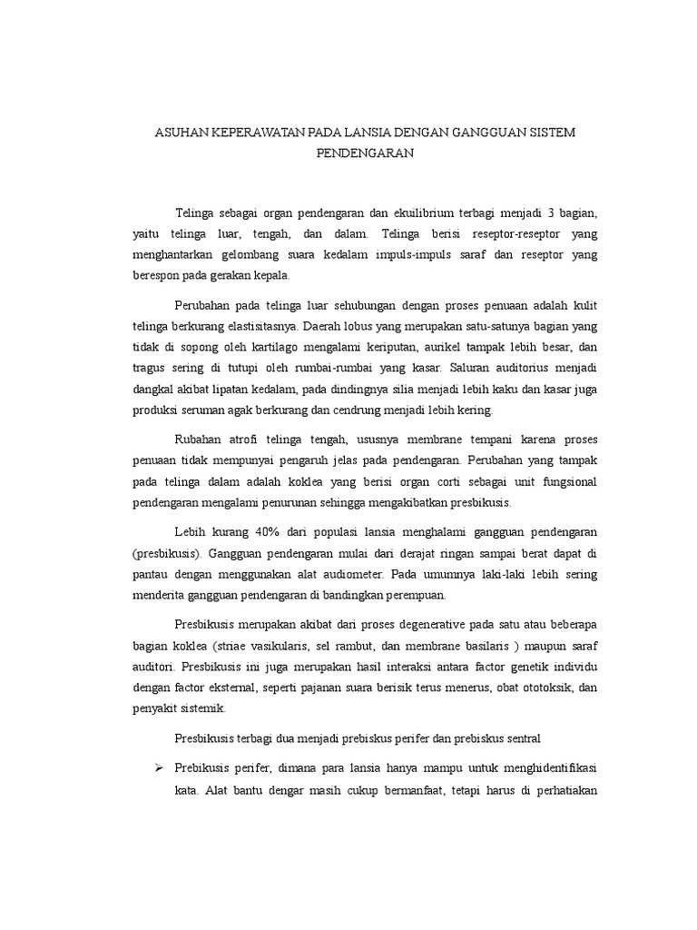 Gangguan Pendengaran Pada Lansia. Di Indonesia, belum ada data pasti tentang berapa persen lansia (usia lebih. Gangguan pendengaran pada lansia juga bisa disebabkan faktor lainnya seperti penumpukan kotoran hingga cedera telinga.