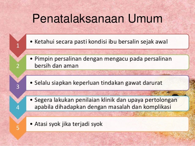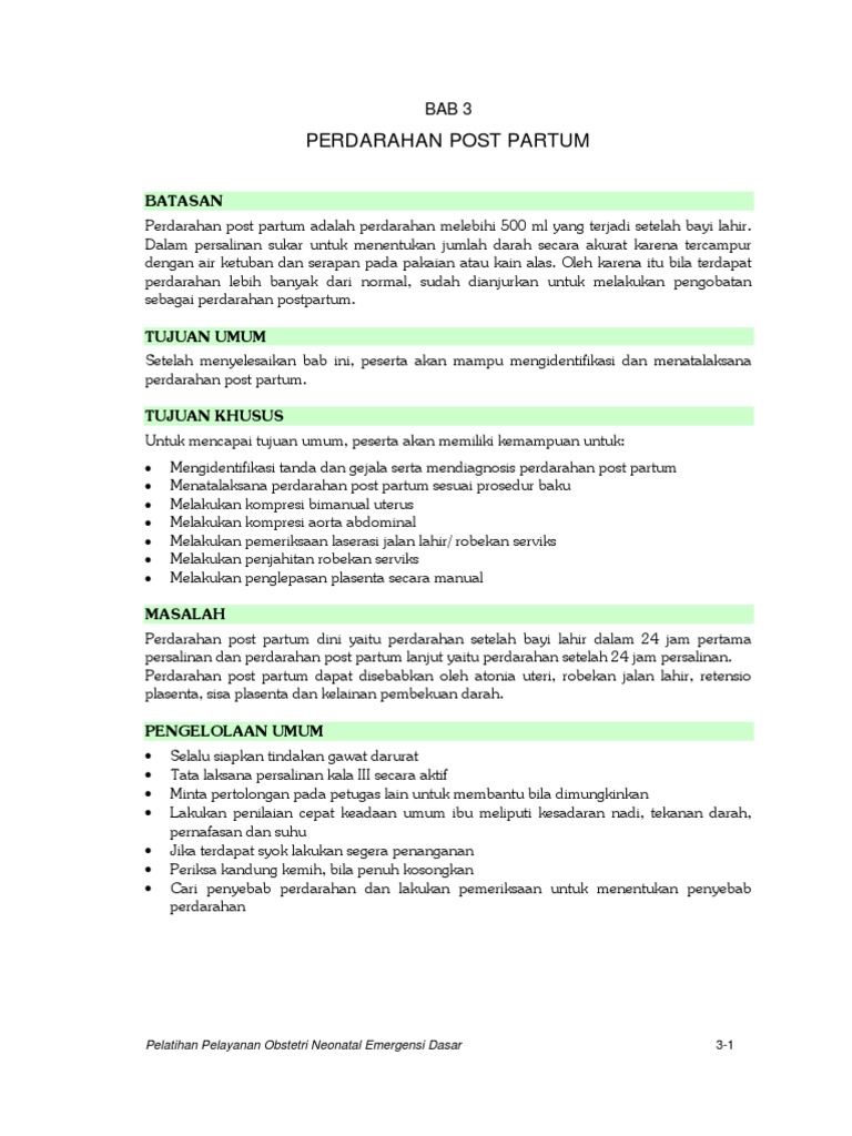 Faktor predisposisi (contohnya, fibroid uterus, hidramnion, kehamilan multipel, gangguan koagulasi ibu dan riwayat perdarahan nifas atau post partum) diidentifikasi sebelum persalinan dan jika mungkin diperbaiki.